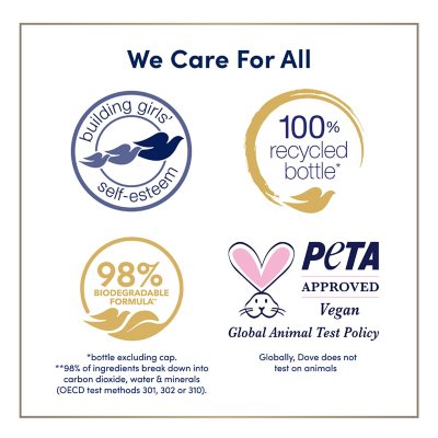 This moisturizing body wash also has a 98% biodegradable formula*. This gentle skin cleanser is packaged in 100% recycled plastic bottles, vegan, and Dove is PETA approved, meaning we do not test on animals, anywhere in the world, so you can feel good about switching to Dove.