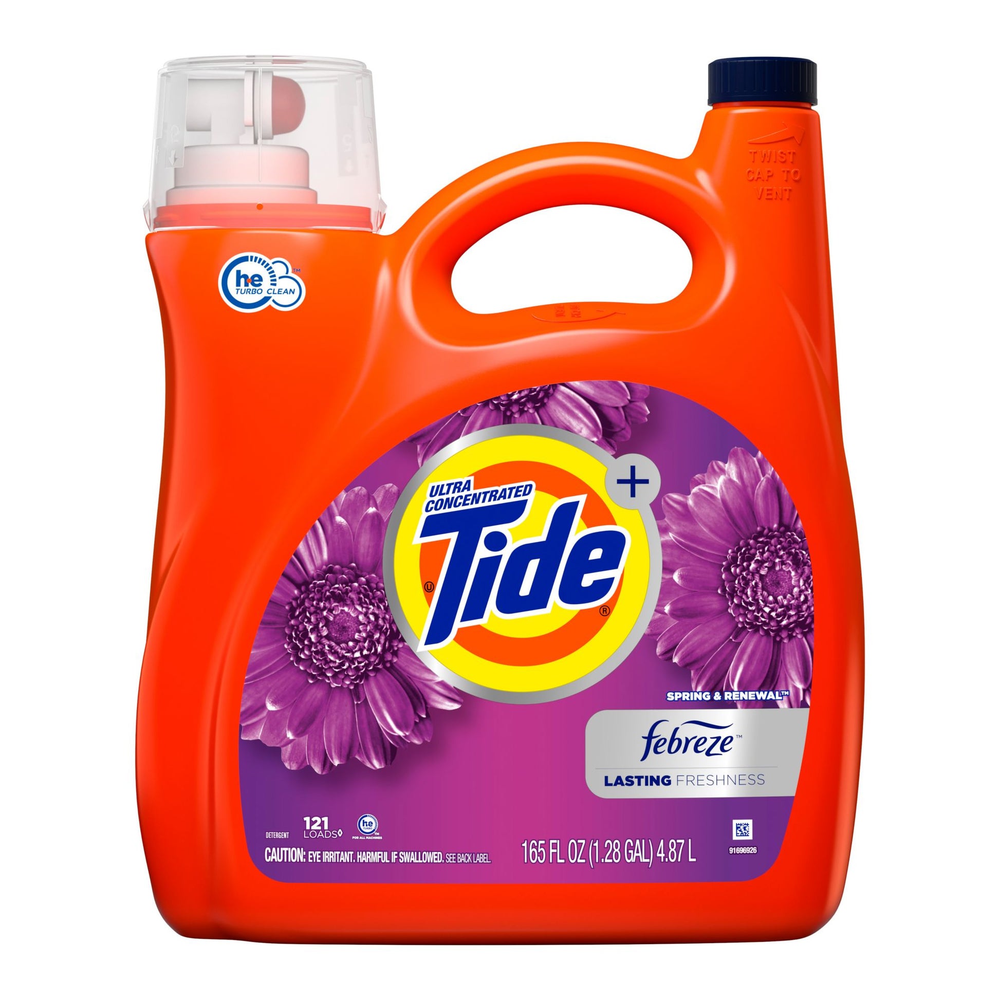 Tide Plus Febreze Freshness Spring & Renewal HE Turbo Clean liquid laundry detergent offers excellent clean and odor removal, plus the Febreze freshness that helps your fabrics stay fresh up to 3x longer*. Thanks to 10x the cleaning power**, it effectively targets tough stains and removes even week-old sweat odors. Also, the Tides formula contains special scent-renewal technology that releases freshness as you move, helping keep your fabrics smelling great all day. Enjoy fresh Spring & Renewal scent and benefit from even more odor-fighting power.*vs. Tide Original **Based on stain removal using 1 dose Tide HE in the quick wash cycle vs. 10 doses of the leading bargain liquid detergent, base variant, in a normal wash cycle.